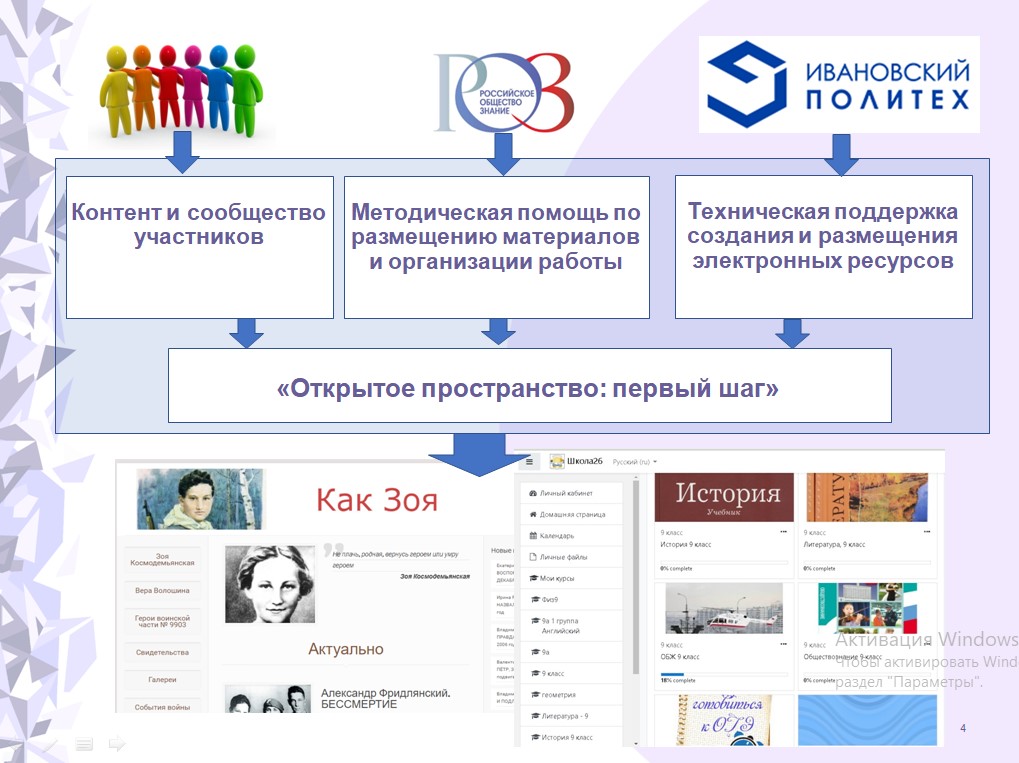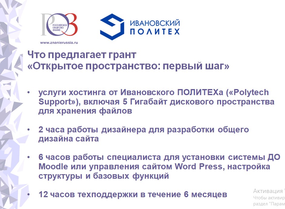 Образование - это общая миссия, направленная на раскрытие возможностей человека. Образование - дело общее, а образовательная среда обязательно должна быть открытой. Чтобы сделать технологии дистанционного образования доступными для наших коллег по образовательному цеху мы предлагаем грант "Открытое пространство: первый шаг" для школ и НКО на создание своей системы ДО или сайта просветительского проекта. Получатели гранта имеют возможность воспользоваться инфраструктурой и помощью специалистов Ивановского ПОЛИТЕХа и Российского общества “Знание” для запуска собственной платформы дистанционного образования или сайта некоммерческого проекта.