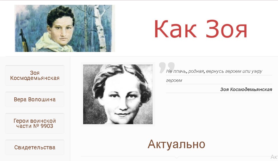 Сайт о Зое Космодемьянской и Вере Волошиной - героях Великой Отечественной Войны.